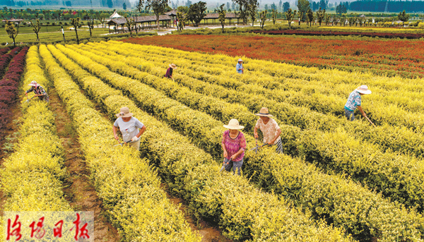 近日,宜阳县莲庄镇莲庄村村民在七彩花海生态园内管理花卉苗木。